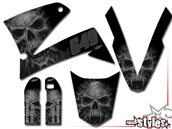 Description: R.I.P.forever basic graphic-kit for KTM LC4 - SXC / SM / SMC / DUKE 620-660 (1998-2007). This kit includes the following decals: fork protectors le./ri., fender front/rear and rad covers le./ri.
