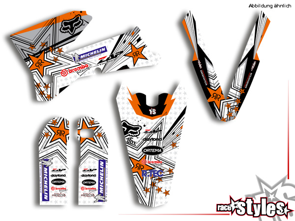 kit de decores básico para KTM SX / SX-F (1998-2006) y EXC / EXC-F / SMR (1998-2007) que consta de horquilla izquierda / derecha, guardabarros delantero / trasero y radiador izquierda / derecha.
