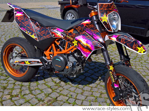 basic graphic-kit for KTM 690 SMC / SMC-R / ENDURO (2008-2017). This kit includes the following decals: fork protectors le./ri., fender front/rear and rad covers le./ri.