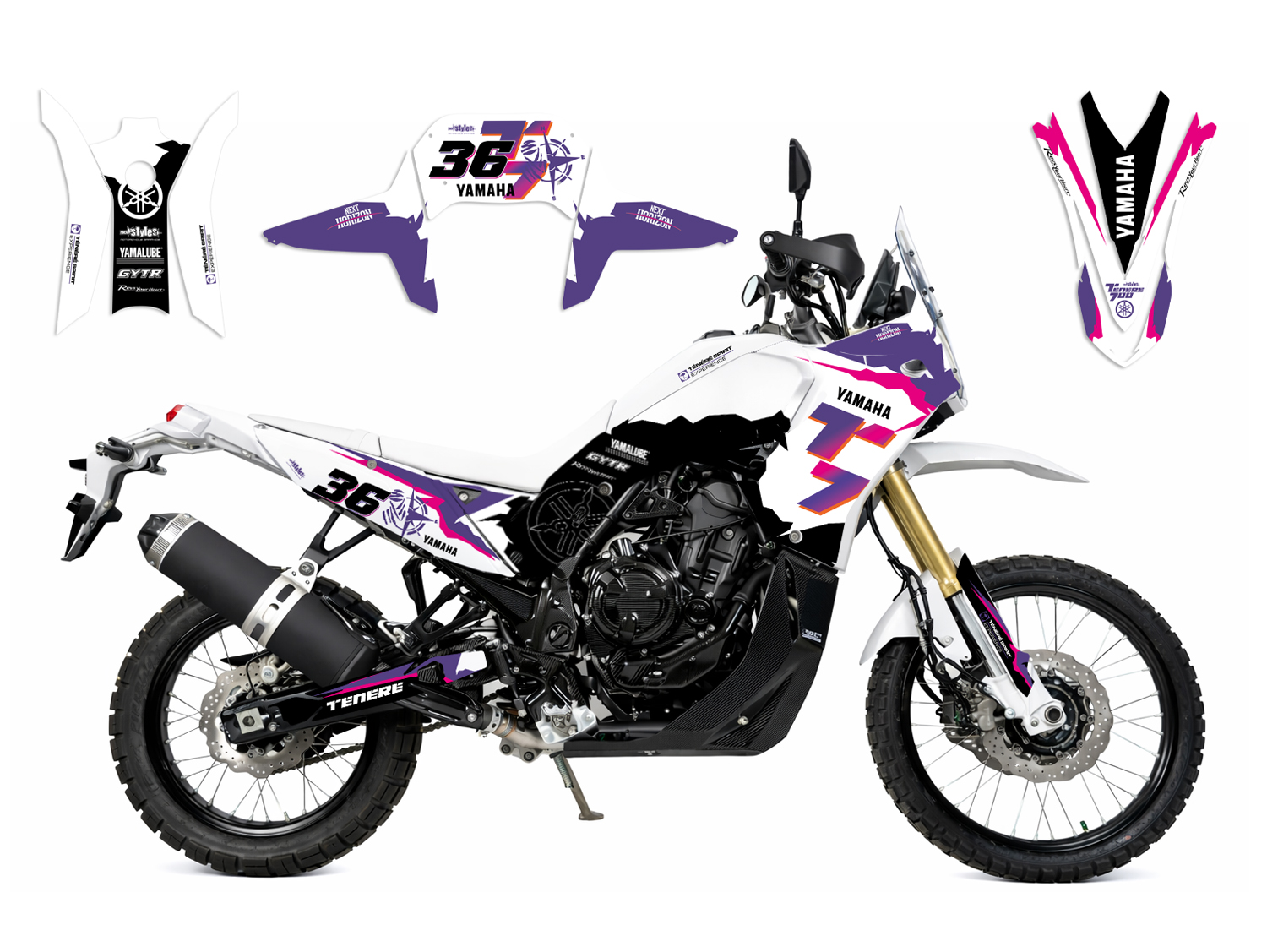 Kit deco completo per tutti i modelli YAMAHA Tenere 700, modelli 2025- comprendente protection de fourche sinistra/destra, parafango anteriore/posteriore, convogliatore sinistra/destra e série adesivi portanumero nel design RETRO 90s.