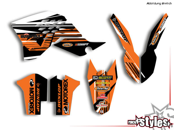 Description: MX-Circuit basic graphic-kit for KTM SX / SX-F (2007-2010) and EXC / EXC-F / SMR (2008-2011). This kit includes the following decals: fork protectors le./ri., fender front/rear and rad covers le./ri.