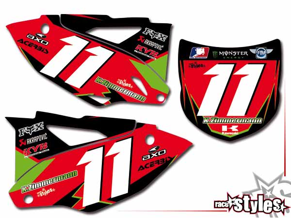 Startnummernfelder Dekor-Kit für KAWASAKI KX / KXF (65 85 125 250 450) Modelle 1990-2005, 2006-2021. inkl. Luftfilterkasten li./re. Du kannst Hintergr.-Farbe, Zahl(en) und/oder Fahrername selbst wählen.