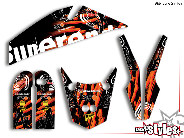 Description: basic graphic-kit for KTM 950 SuperEnduro 2006-2008 and KTM 950 SuperMoto R 2007-2008. This kit includes the following decals: fork protectors le./ri., fender front/rear and rad covers le./ri.