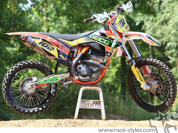 basic graphic-kit for KTM SX / SX-F (2011-2012, 2013-2015) and EXC / EXC-F / SMR (2012-2013, 2014-2016). This kit includes the following decals: fork protectors le./ri., fender front/rear and rad covers le./ri.