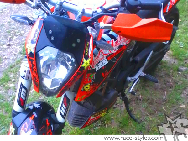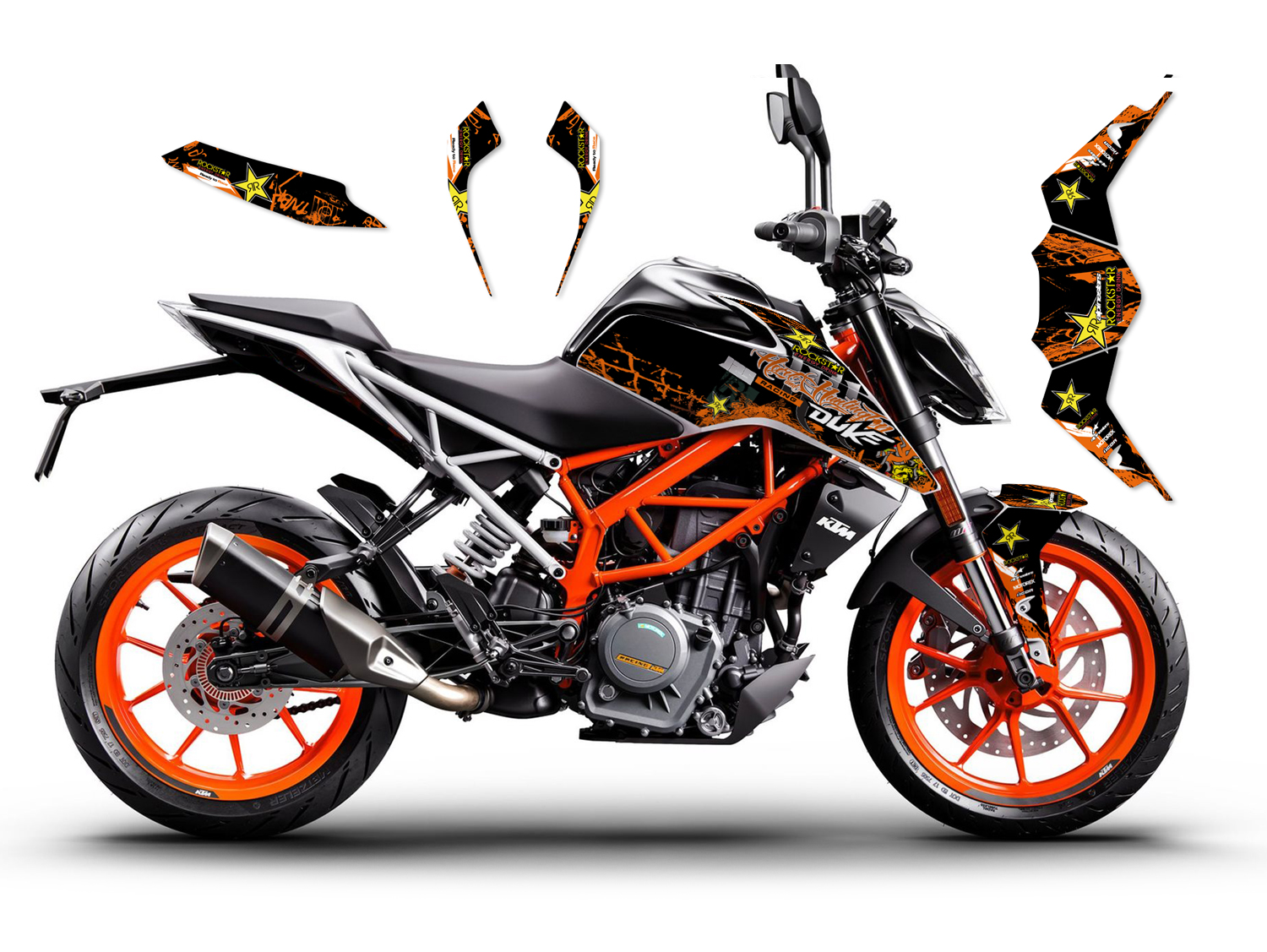 Description: Full decals kit for KTM DUKE 125 / 200 (2011-2025) and KTM SMCR 125 (2026-. This kit includes the following stickers: fork protectors le./ri., fender front/rear, rad covers le./ri. and a full number plate kit in a ROCKSTAR design.