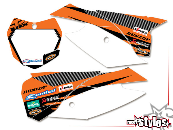 Startnummernfelder Dekor-Kit passend für KTM SX / SX-F (2011-2012, 2013-2015) und EXC / EXC-F / SMR (2012-2013, 2014-2016). Die Hintergrundfarbe ist freiwählar.