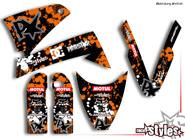 Beschreibung: Basic Dekor-Kit passend für KTM LC4 - SXC / SM / SMC / DUKE 620-660 (1998-2007) bestehend aus Gabel li./re., Kotflügel vo./hi. und Kühler li./re.
