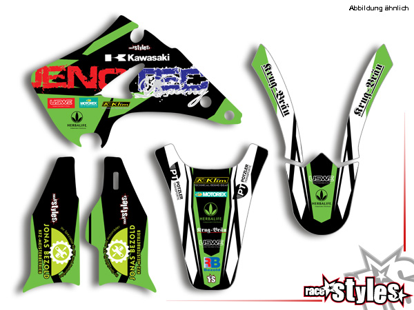 Basic Dekor-Kit für KAWASAKI KX / KXF (65 85 125 250 450) Modelle 1990-2005, 2006-2021 bestehend aus Gabel li./re., Kotflügel vo./hi. und Kühler li./re.