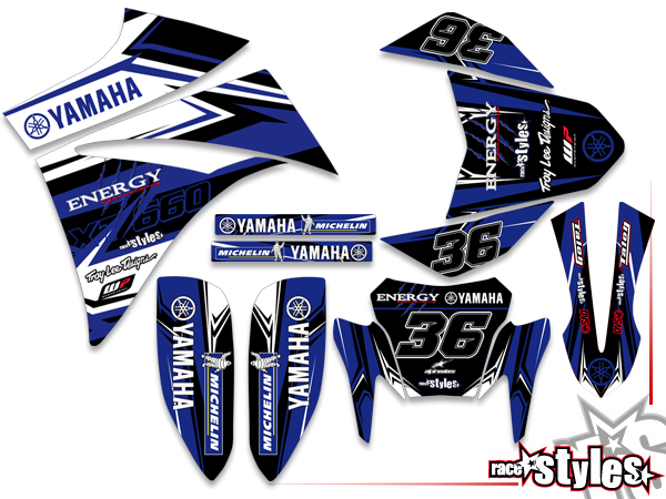 Description: basic graphic-kit for YAMAHA XT660X / R (2004-2014). This kit includes the following decals: fork protectors le./ri., fender front/rear and rad covers le./ri.