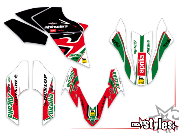 Description: Alitalia-LTD. basic graphic-kit for APRILIA Dorsoduro 750 / 900 / 1200, 2008-2020. This kit includes the following decals: fork protectors le./ri., fender front/rear and rad covers le./ri.