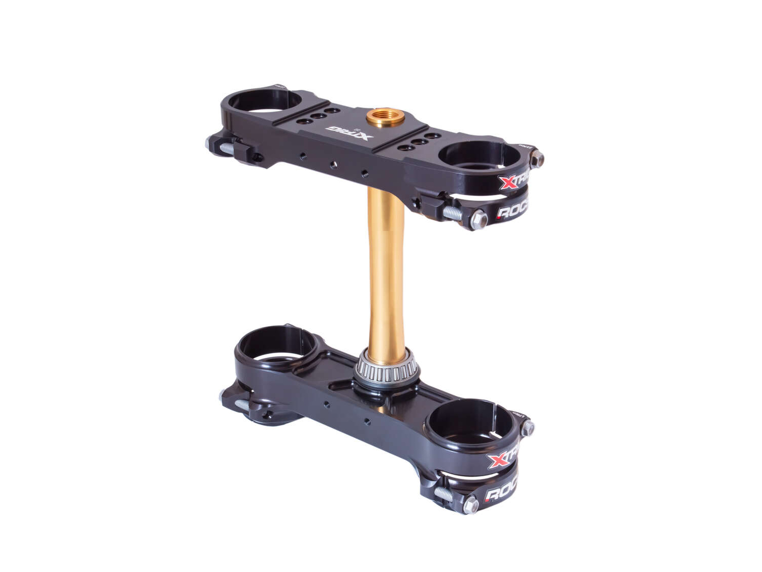 Das Revolutionary Opposing Clamp System kurz ROCS war eine der spektakulärsten und aufwändigsten Entwicklungen von XTRIG in den letzten Jahren. Die Vorteile dieses Systems im Vergleich zu einer konventionellen Gabelbrücke sind die geringere Verformung der Gabelstandrohre im Klemmbereich, was sich merklich auf das Ansprechverhalten der Gabel auswirkt. Aber auch die Konstruktion mit den beiden gegenüberliegenden Klemmschellen die durch den Selbsthemmungseffekt mehr Sicherheit gegen das Verdrehen der Gabel gewährleistet.