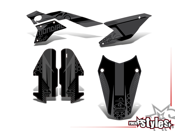 Komplettset für Mondial SMX 125i SUPERMOTO / ENDURO. bestehend aus Kühler li./re., Kotflügel vo./hi. und Startnummernfelder-Kit.