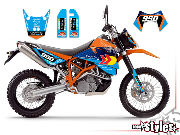 Komplettset passend für KTM 950 Supermoto 2006-2008 bestehend aus Gabel li./re., Kühler li./re., Kotflügel vo./hi. und Startnummernfelder-Kit.