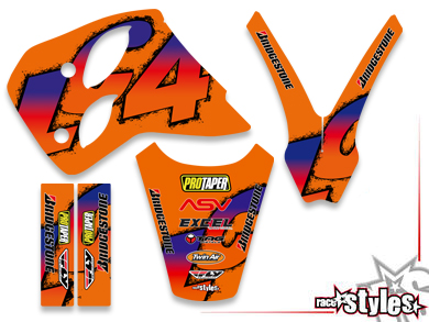 Description: basic graphic-kit for KTM LC4 / LC2 / DUKE / EGS /SXC 400-620 (1990-1997). This kit includes the following decals: fork protectors le./ri., fender front/rear and rad covers le./ri.