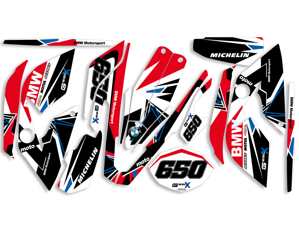 Komplettset passend für BMW G 650 Xmoto / BMW G 650 Xchallenge (2007-2010) Modelle bestehend aus Gabel li./re., Kühler li./re., Kotflügel vo./hi. und Startnummernfelder-Kit.