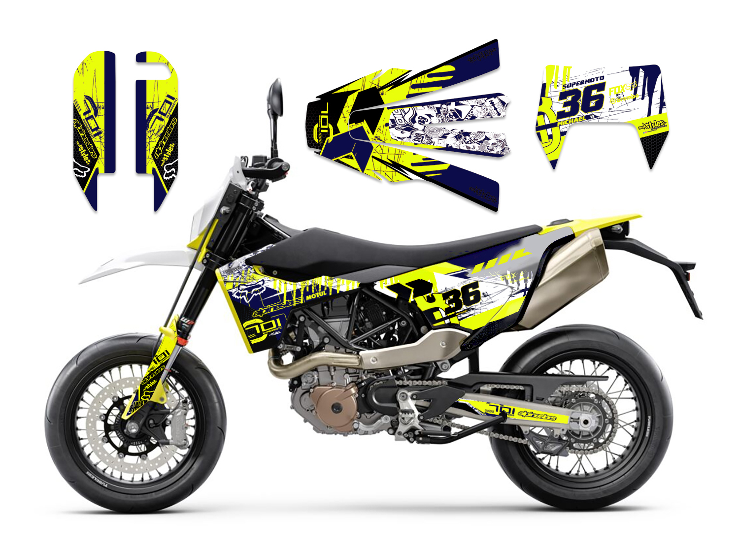 Description: Full decals kit for HUSQVARNA 701. This kit includes the following stickers: fork protectors le./ri., fender front/rear, rad covers le./ri., a full number plate kit and swingarm le./ri. in a SCRATCHES design.
