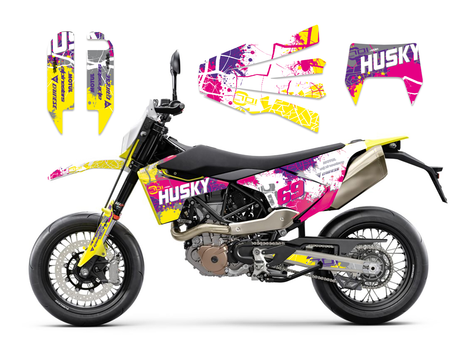 Description: Full decals kit for HUSQVARNA 701. This kit includes the following stickers: fork protectors le./ri., fender front/rear, rad covers le./ri., a full number plate kit and swingarm le./ri. in a STONE-PINK design.