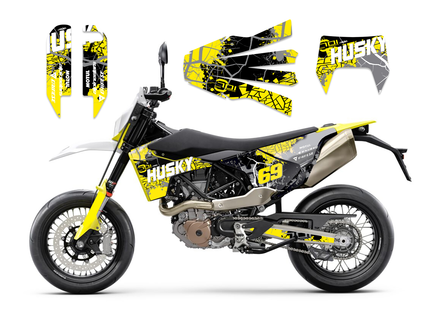 Description: Full decals kit for HUSQVARNA 701. This kit includes the following stickers: fork protectors le./ri., fender front/rear, rad covers le./ri., a full number plate kit and swingarm le./ri. in a STONE-BLACK design.