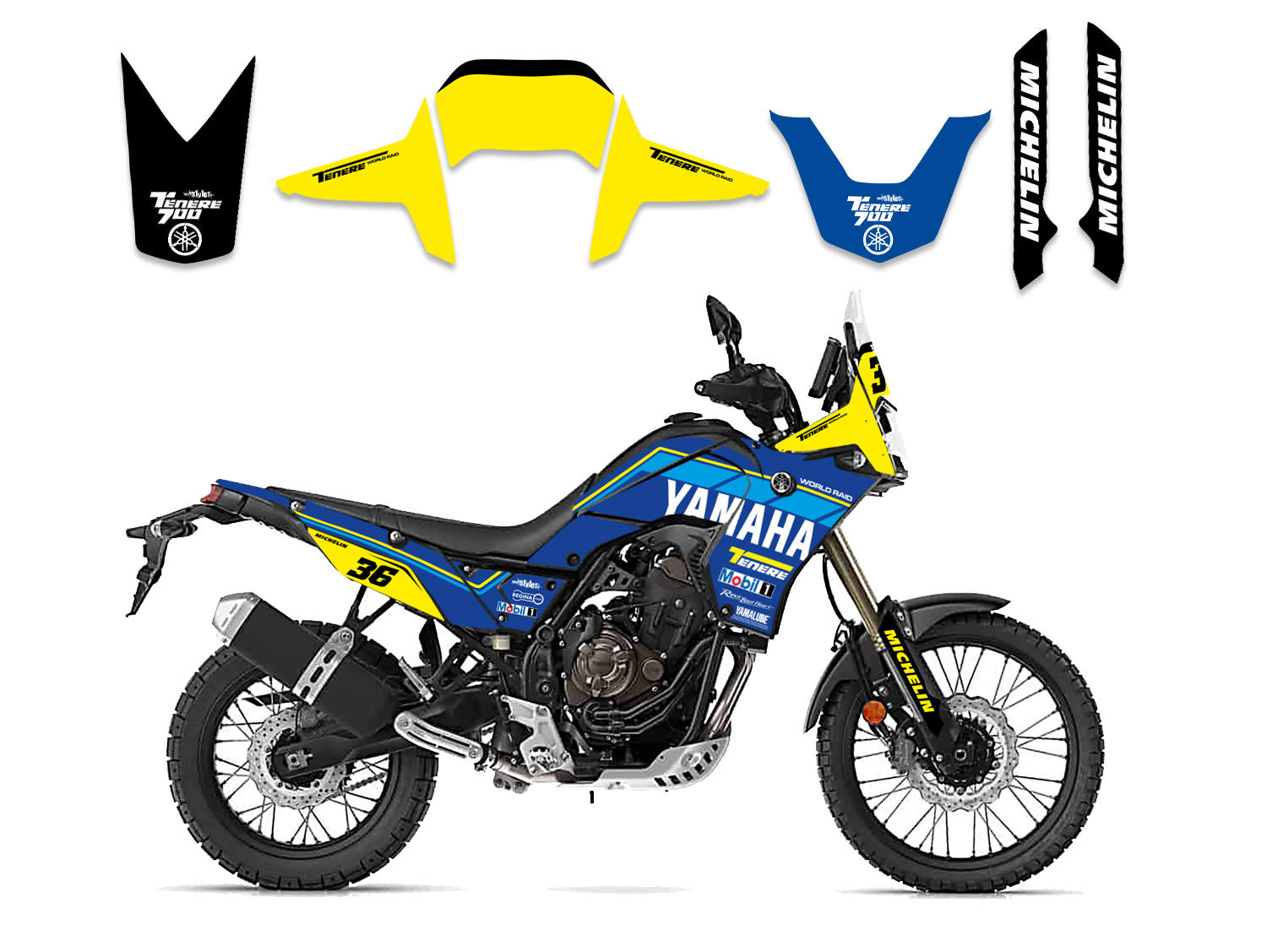 Description: Full decals kit for all YAMAHA Tenere 700 models. This kit includes the following stickers: fork protectors le./ri., fender front/rear, rad covers le./ri., a full number plate kit and swingarm le./ri. in a MobilOne design.