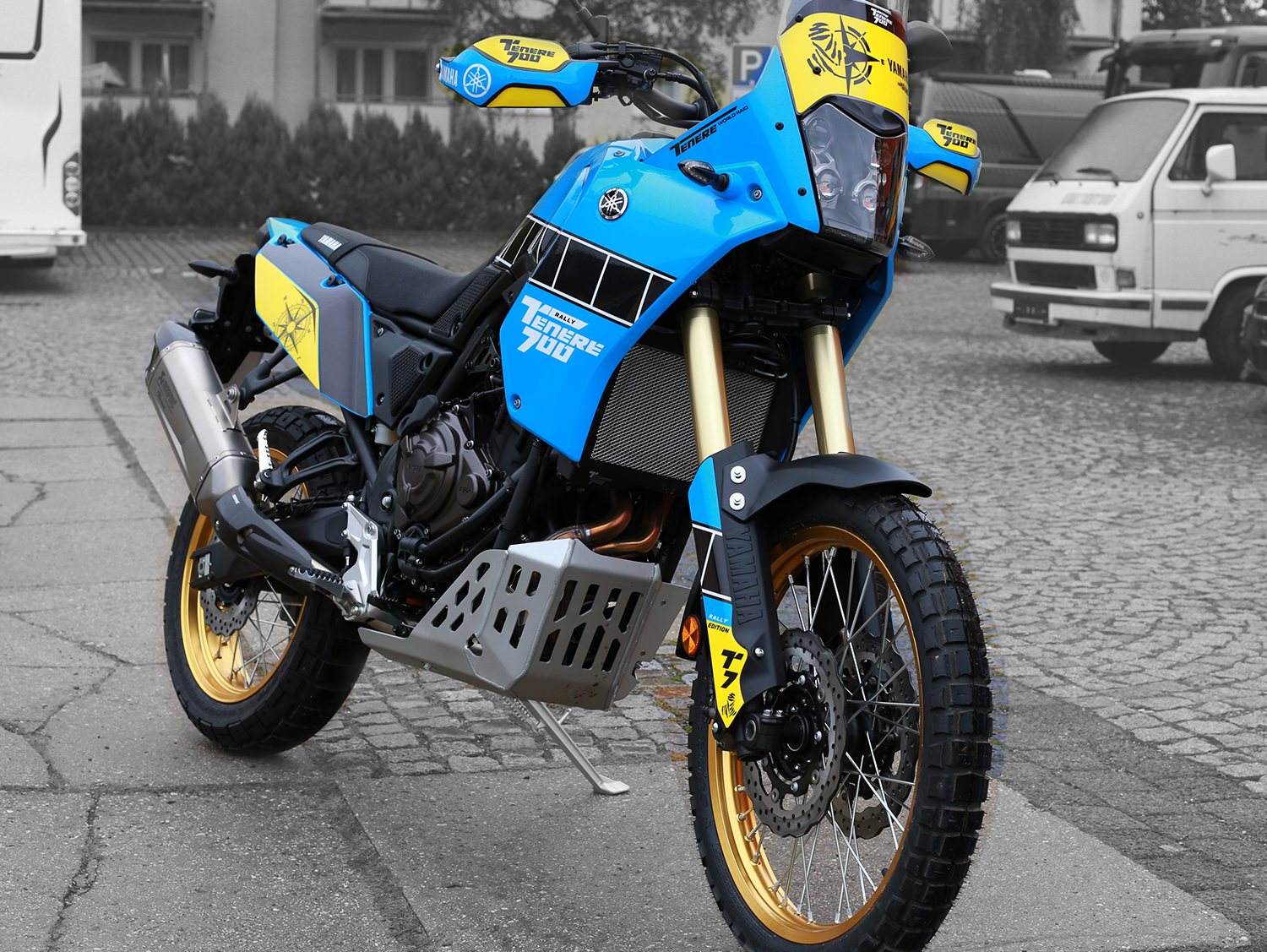 Description: Full decals kit for all YAMAHA Tenere 700 models. This kit includes the following stickers: fork protectors le./ri., fender front/rear, rad covers le./ri., a full number plate kit and swingarm le./ri. in a RetroBluedesign