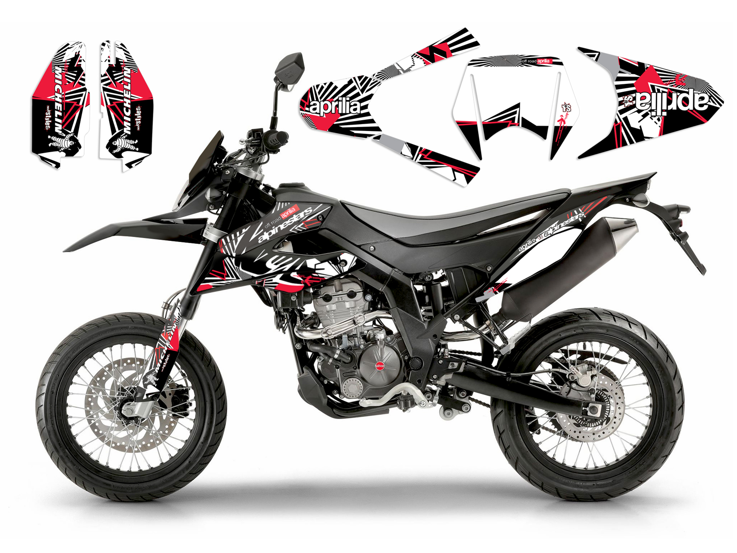 Description: Full decals kit for APRILIA SX / RX 50 - 125. This kit includes the following stickers: fork protectors le./ri., fender front/rear, rad covers le./ri., a full number plate kit and swingarm le./ri. in a STRIPES design.