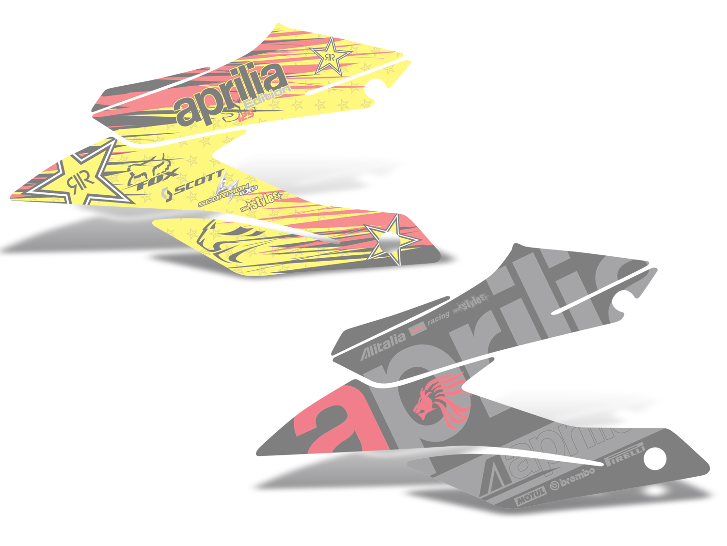 Description: Rad cover graphics le./ri. for APRILIA SX / RX 50 - 125 in a design of your choice. (Please select the corresponding graphic kit number of your desired design!)