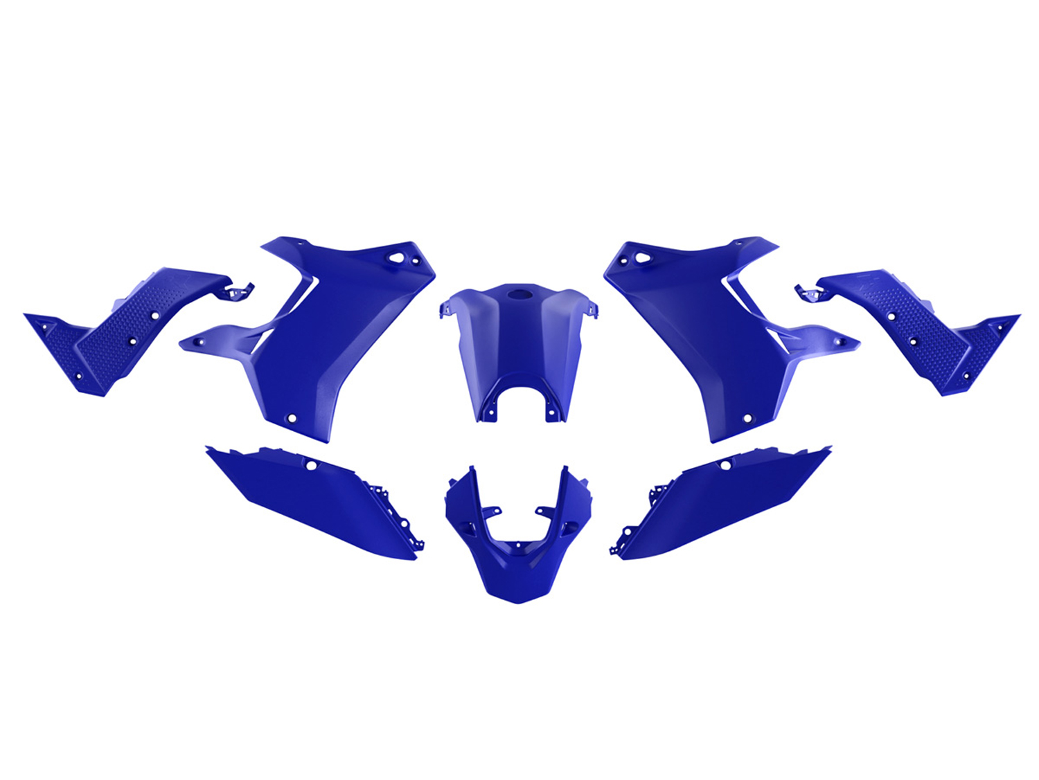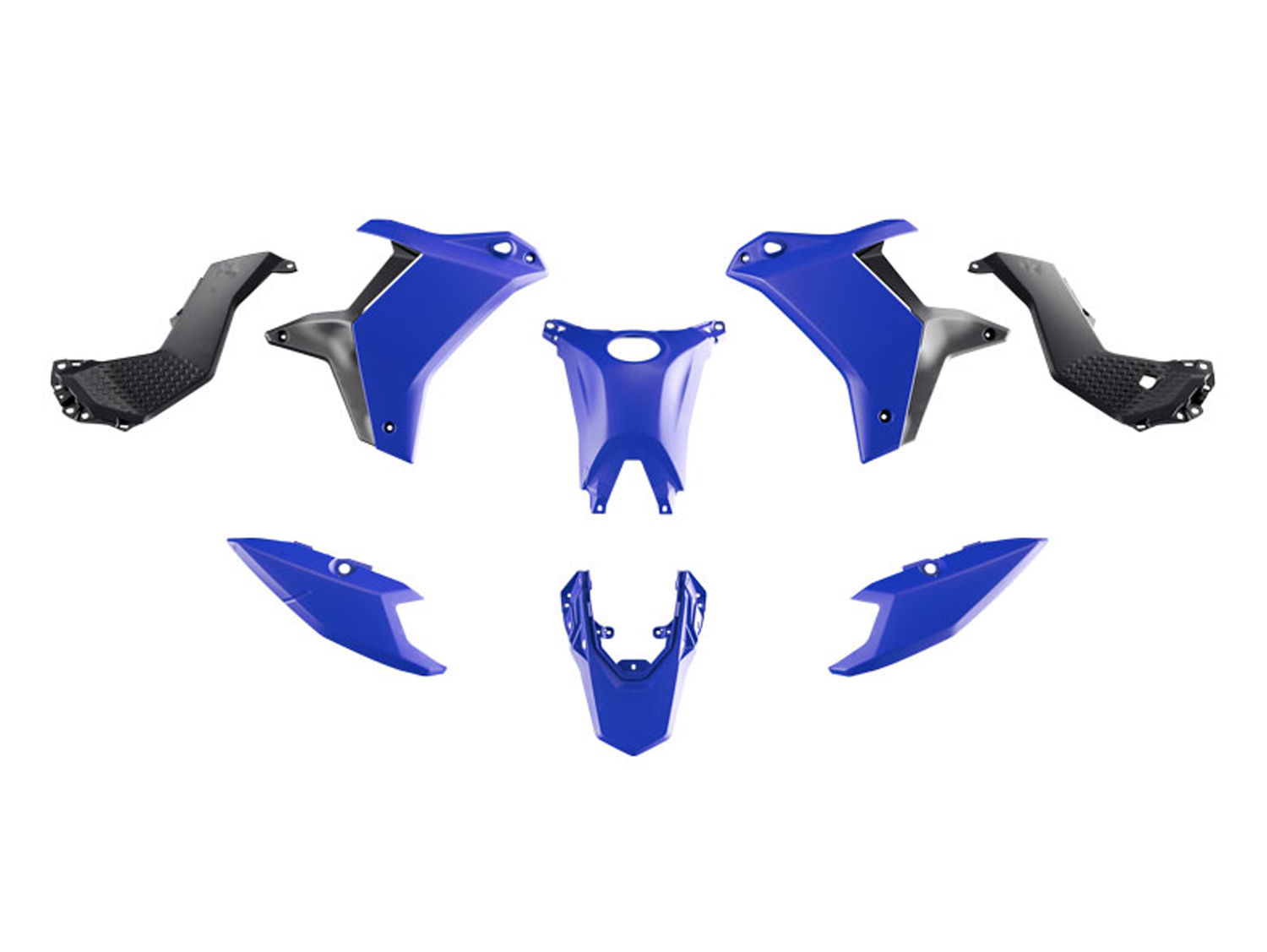 Dieser Plastik-Kit besteht aus den Kühlerverkleidungen li./re., Tankabdeckung, mittlere Rahmenabdeckung li./re., Nummerntafeln hinten li./re. und Kotflügel hinten. (Mit den Originalschrauben ist er plug & play fähig und einfach zu montieren!)