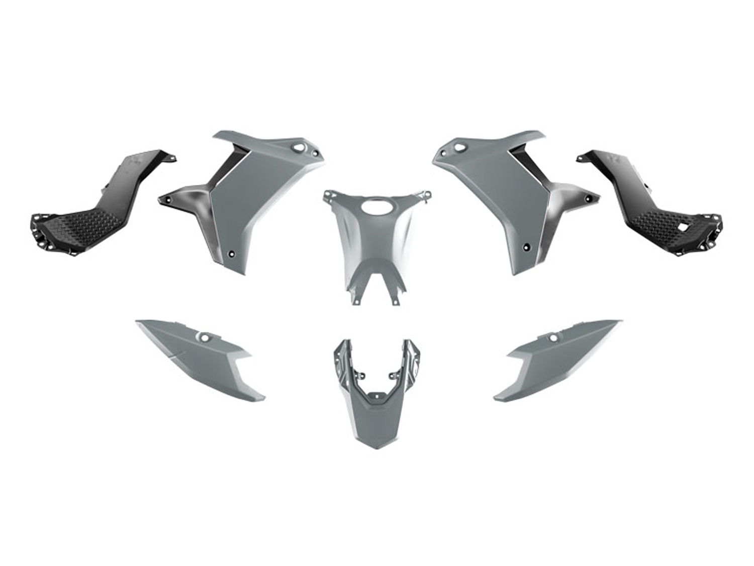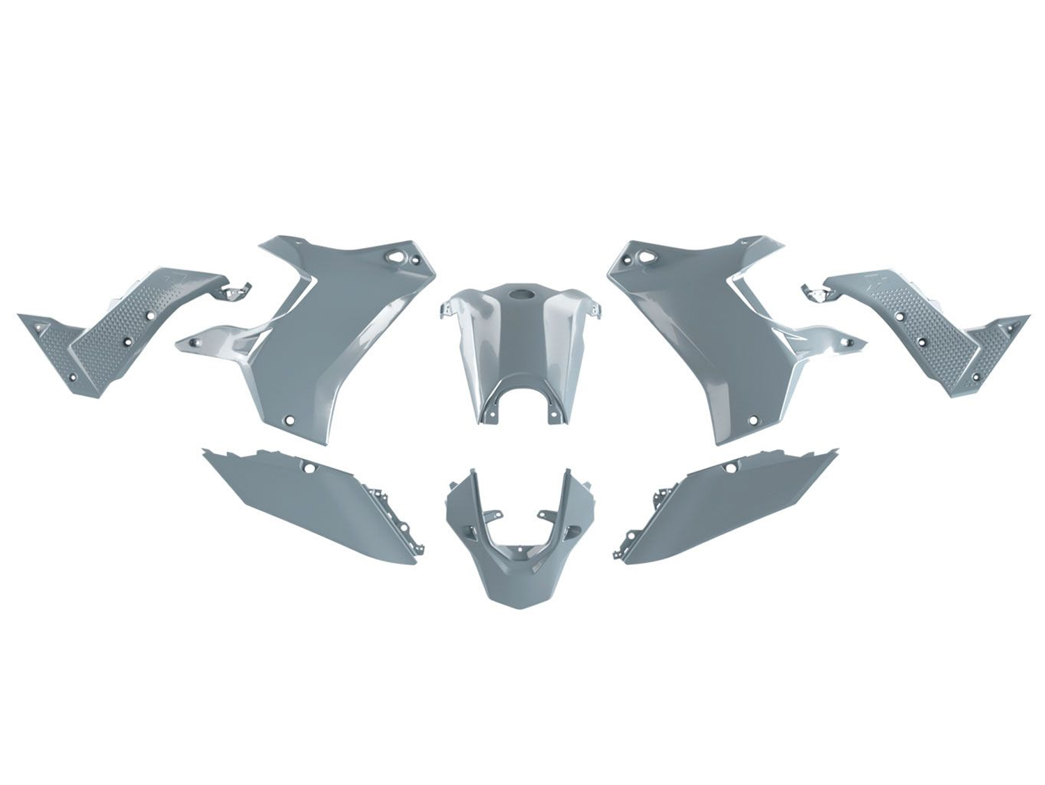 This plastic kit consists of the radiator covers left/right, tank cover, middle frame cover left/right, number plates at the back left/right. and rear fender. (With the original screws it is plug & play and easy to assemble!)