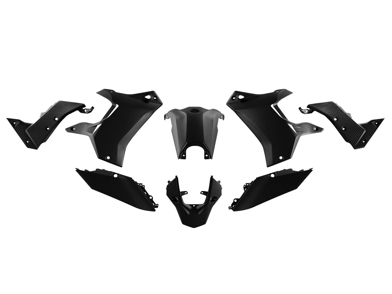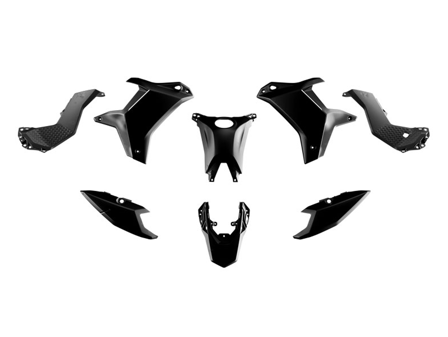 This plastic kit consists of the radiator covers left/right, tank cover, middle frame cover left/right, number plates at the back left/right. and rear fender. (With the original screws it is plug & play and easy to assemble!)