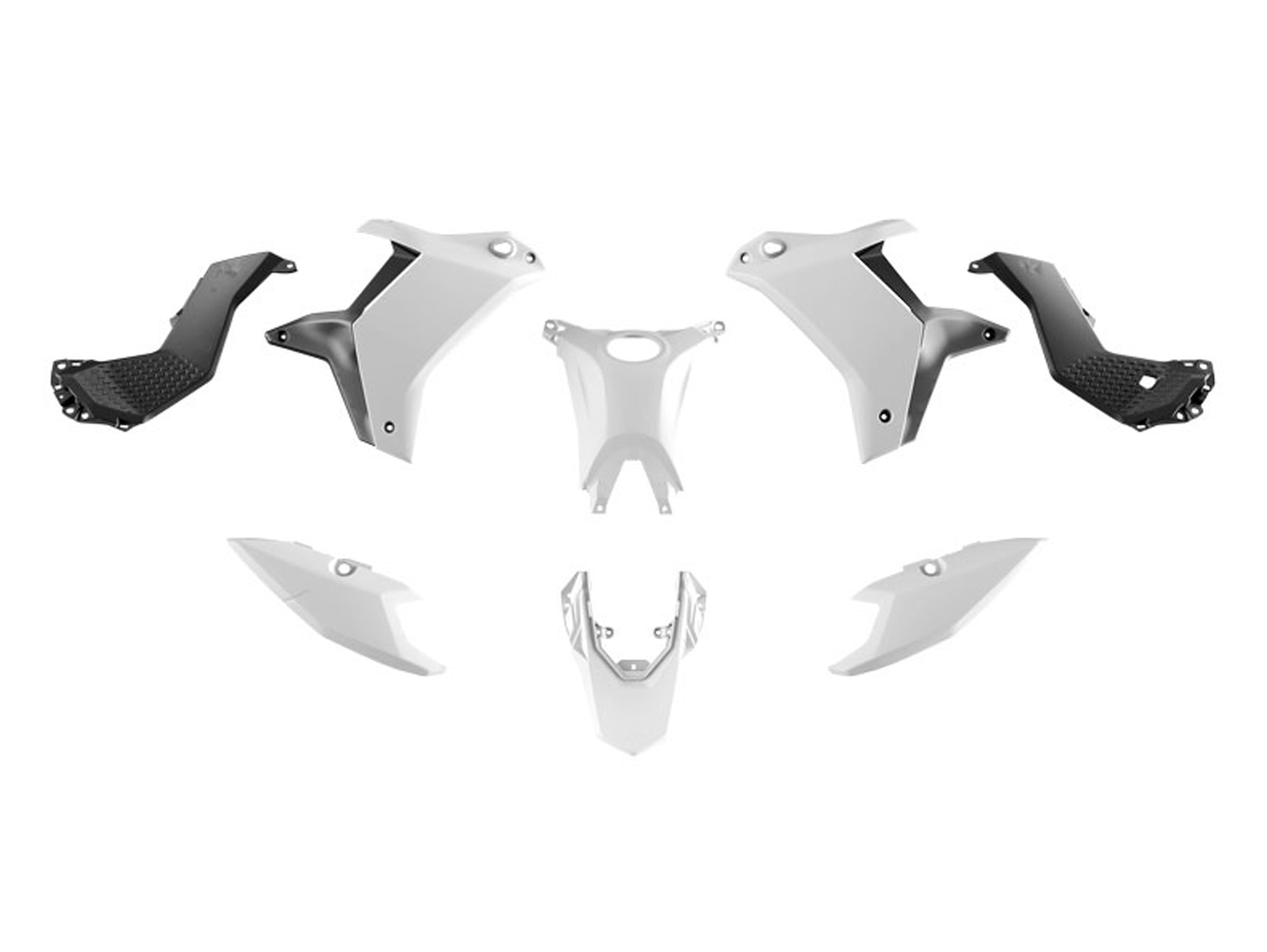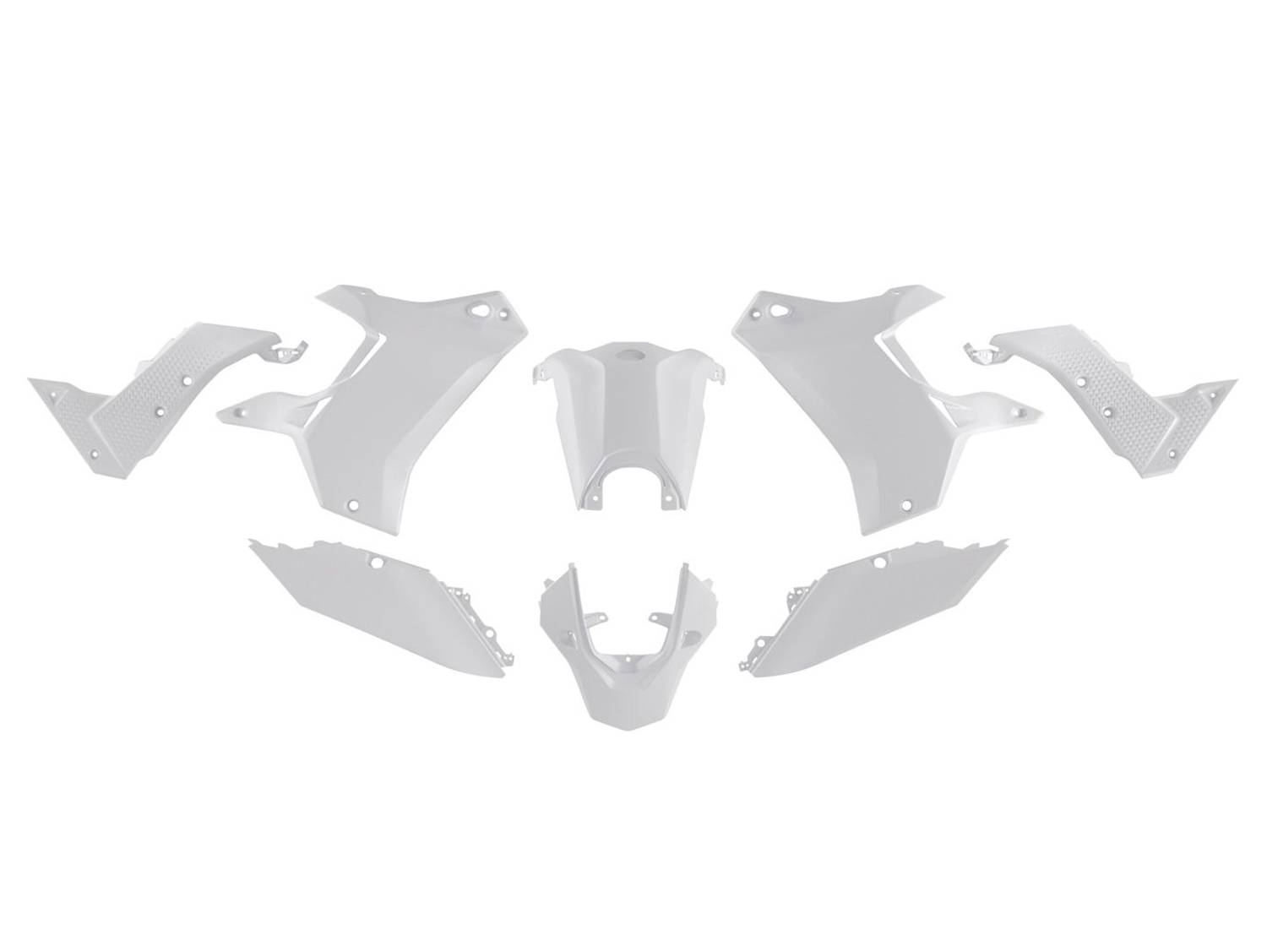 Dieser Plastik-Kit besteht aus den Kühlerverkleidungen li./re., Tankabdeckung, mittlere Rahmenabdeckung li./re., Nummerntafeln hinten li./re. und Kotflügel hinten. (Mit den Originalschrauben ist er plug & play fähig und einfach zu montieren!)