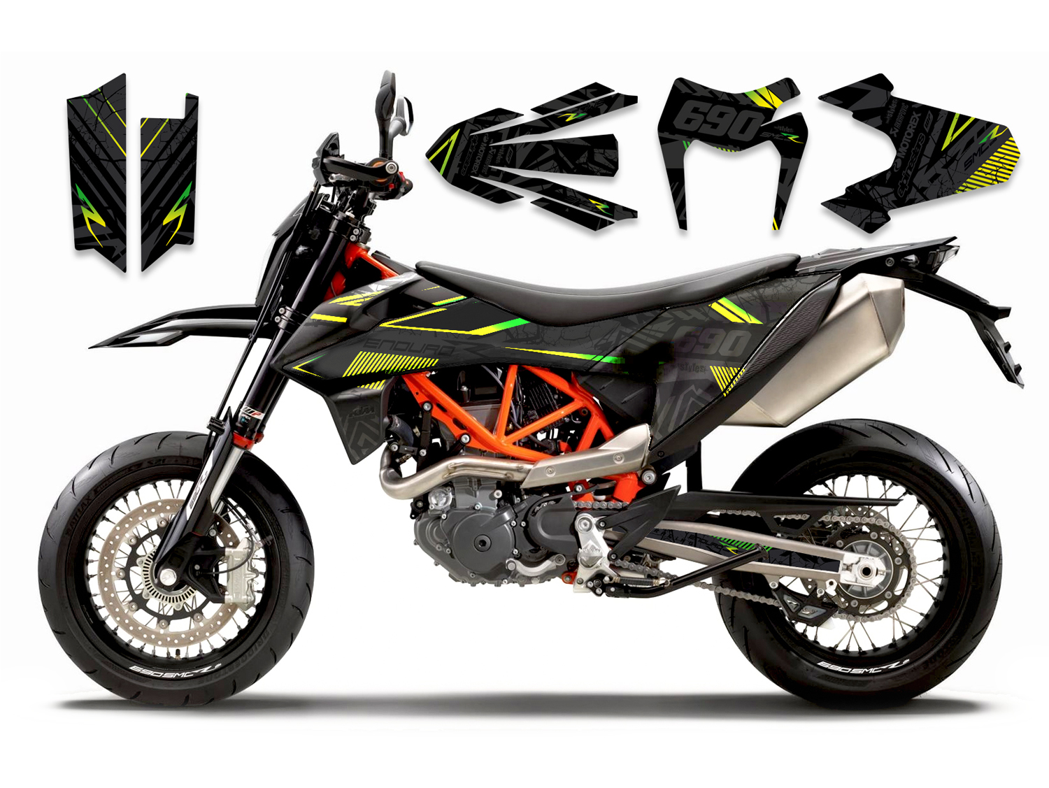 Description: Full decals kit for KTM SMC 690 R / ENDURO (2019-2024). This kit includes the following stickers: fork protectors le./ri., fender front/rear, rad covers le./ri., a full number plate kit and swingarm le./ri. in a NeonEdition design.