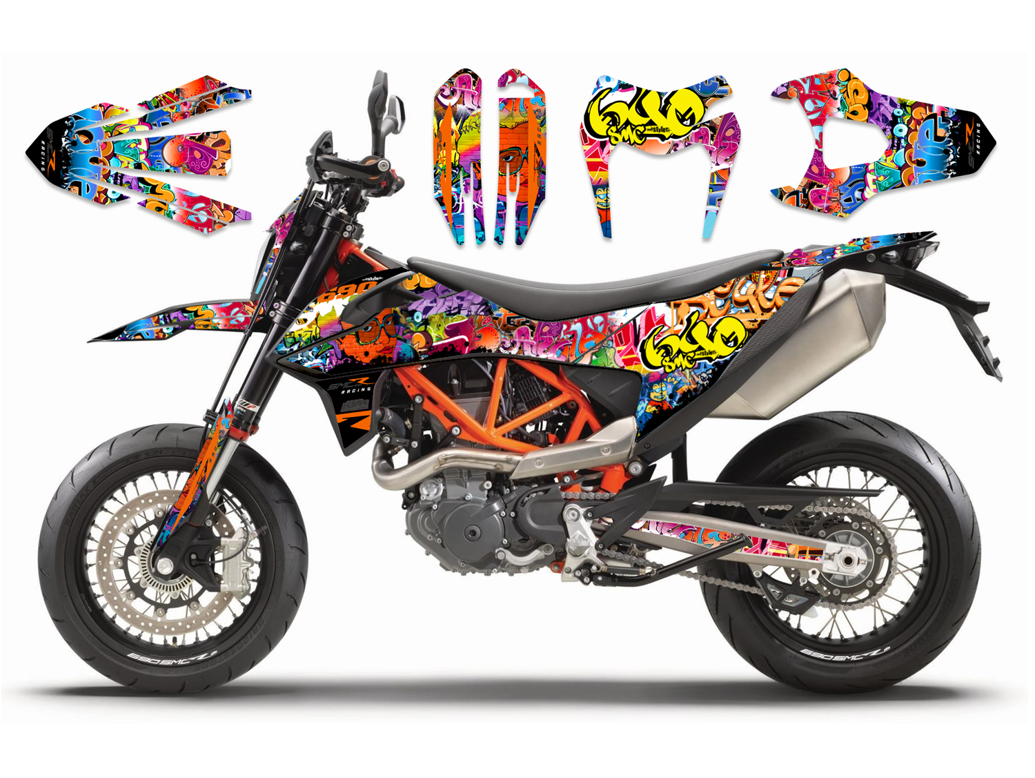 Description: Full decals kit for KTM SMC 690 R / ENDURO (2019-2024). This kit includes the following stickers: fork protectors le./ri., fender front/rear, rad covers le./ri., a full number plate kit and swingarm le./ri. in a StickerBomb design.