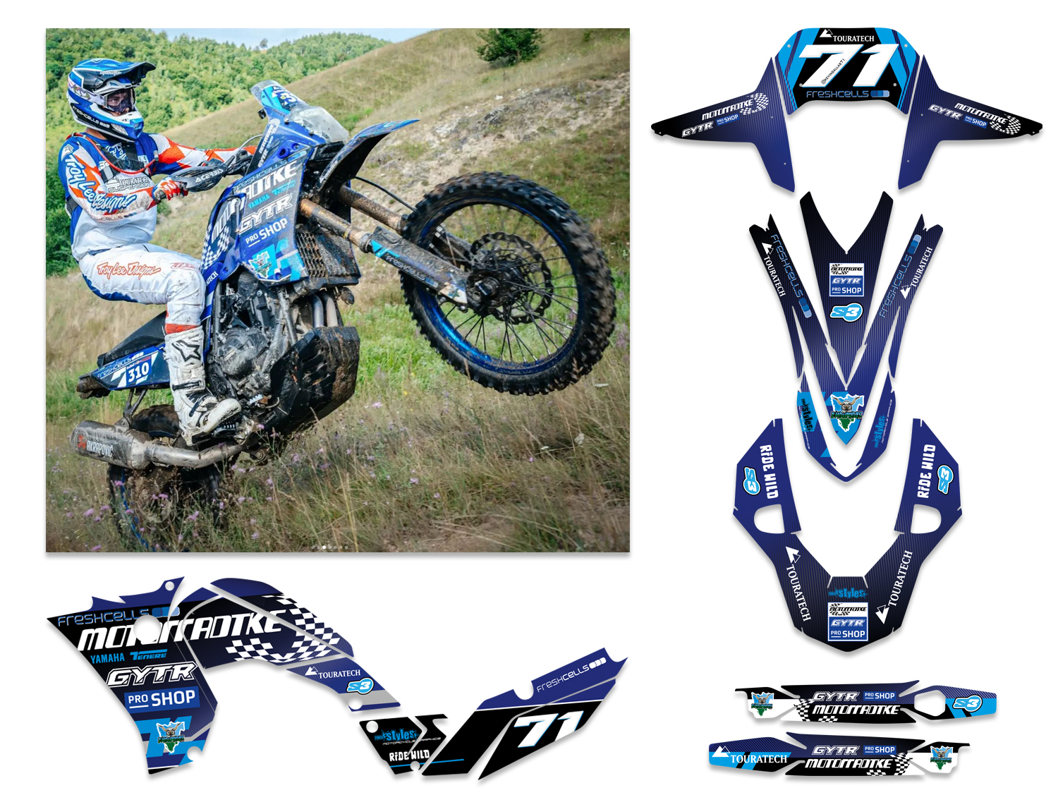 Description: Full decals kit for all YAMAHA Tenere 700 models. This kit includes the following stickers: fork protectors le./ri., fender front/rear, rad covers le./ri., a full number plate kit and swingarm le./ri. as Romaniacs winner design, raced by Kevin Gallas.