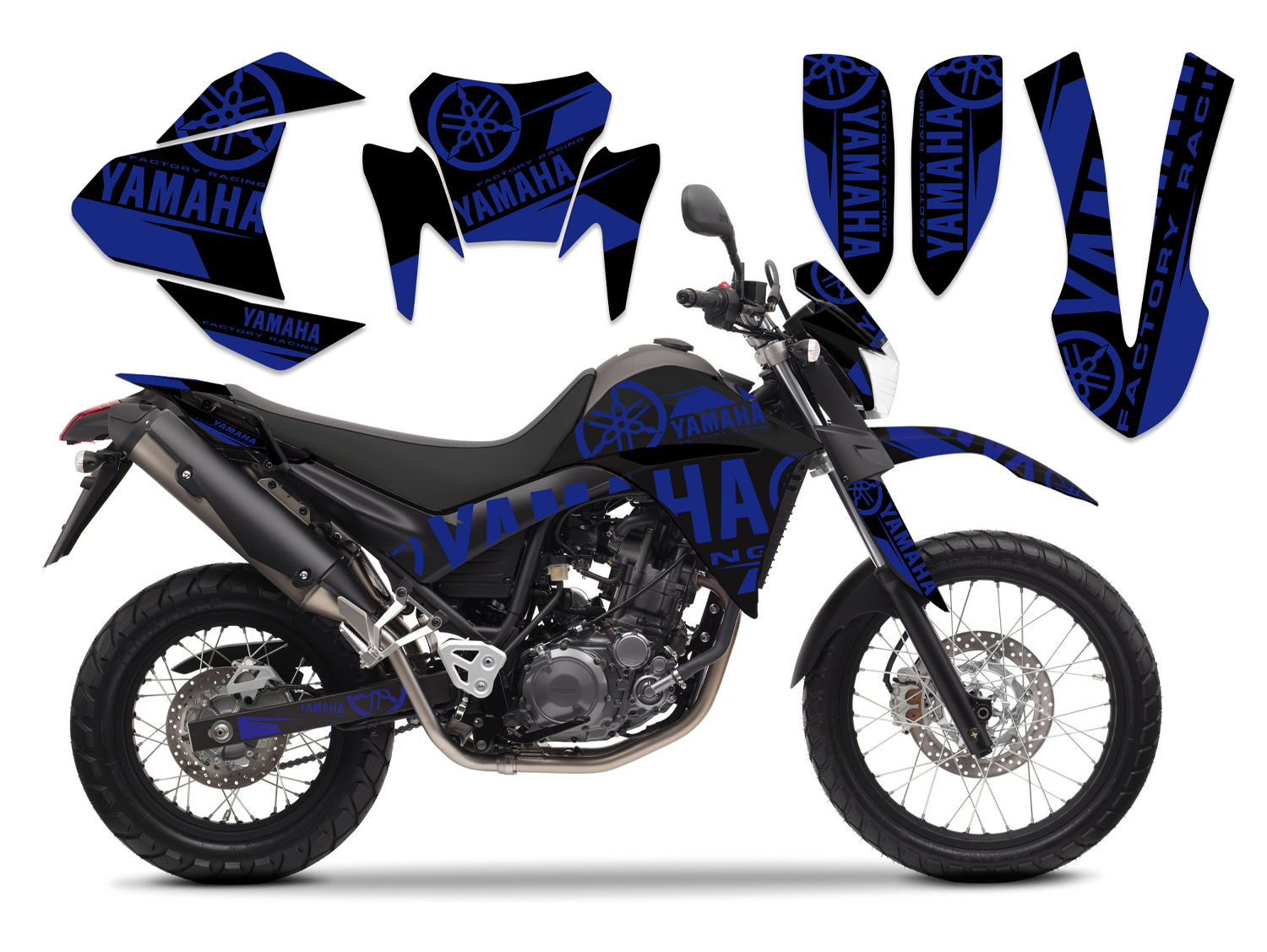 Description: Full decals kit for YAMAHA XT660X / R (2004-2014). This kit includes the following stickers: fork protectors le./ri., fender front/rear, rad covers le./ri., a full number plate kit and swingarm le./ri. in a FactoryBlue design.