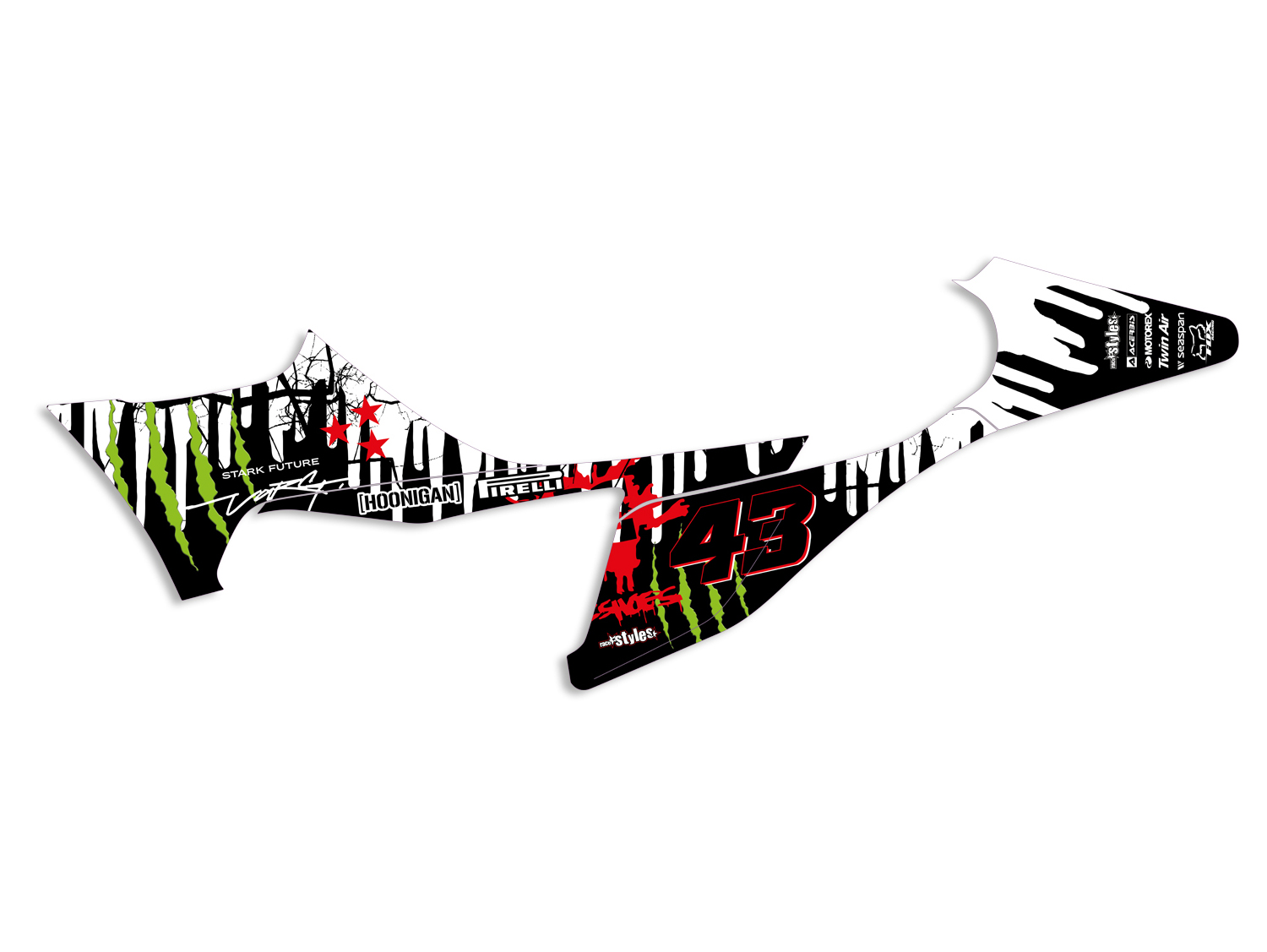 Description: Full graphic KIT for all STARK VARG models. This kit includes the following stickers: fork protectors le./ri., fender front/rear, rad covers le./ri., a full number plate kit and swingarm le./ri. in a Hoonigan design.