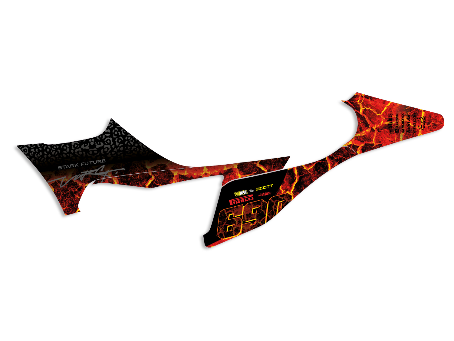Description: Full graphic KIT for all STARK VARG models. This kit includes the following stickers: fork protectors le./ri., fender front/rear, rad covers le./ri., a full number plate kit and swingarm le./ri. in a StickerBomb design.