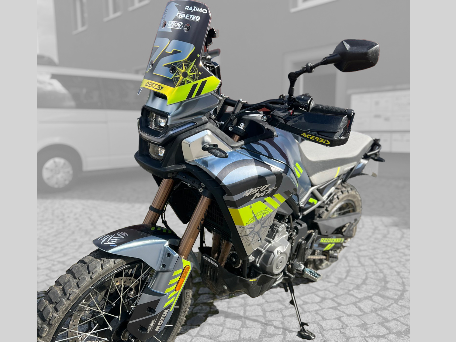 Description: Full decals kit for all CFMOTO MT 450 (2024-2025) models. This kit includes the following stickers: fork protectors le./ri., fender front/rear, rad covers le./ri., a full number plate kit and swingarm le./ri. in a BlueStripes design.