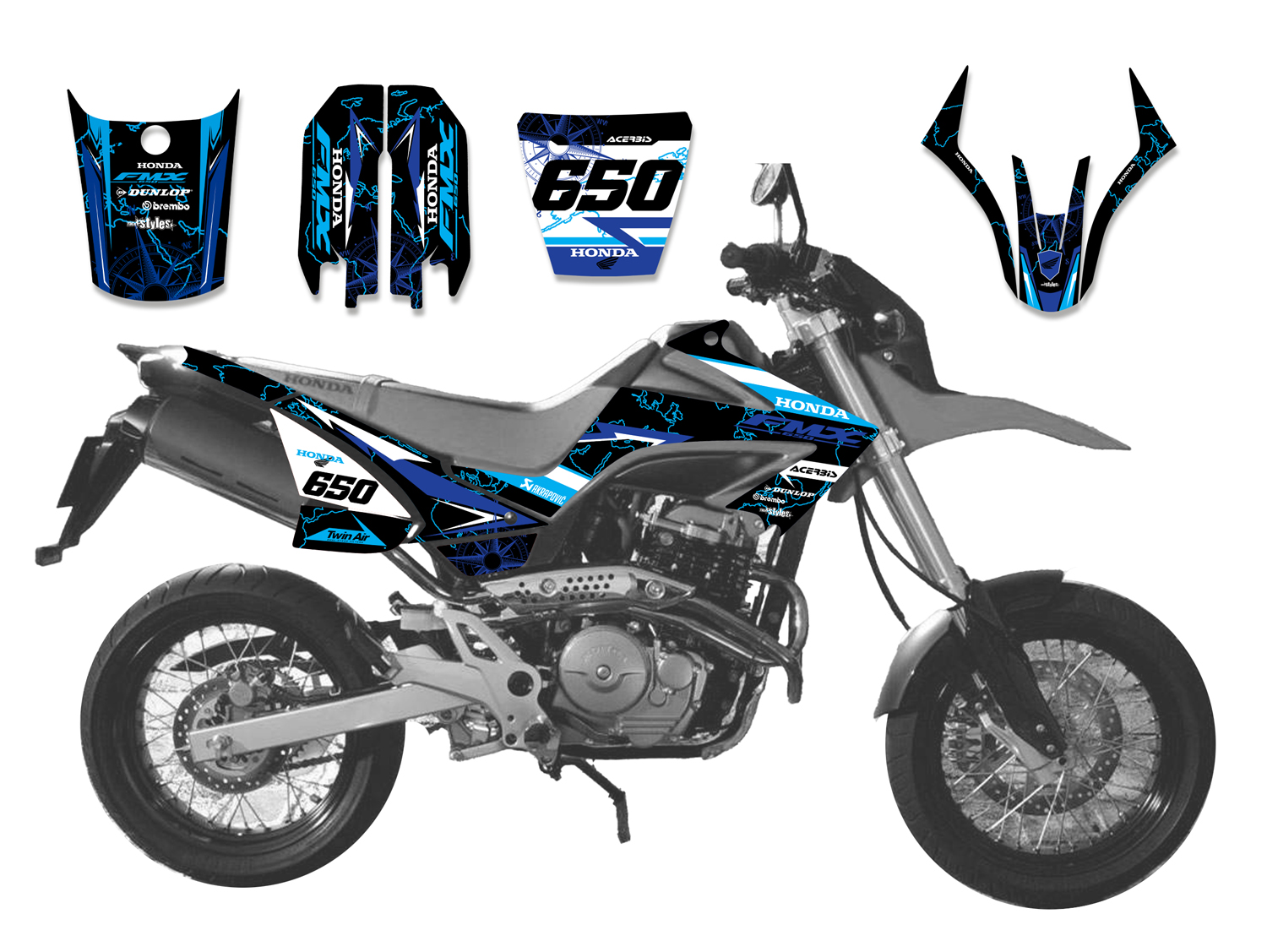 Description: full graphic KIT for HONDA FMX 650, 2005-2007 models. This kit includes the following decals: fork protectors le./ri., fender front/rear, rad covers le./ri. and a full number plate kit.