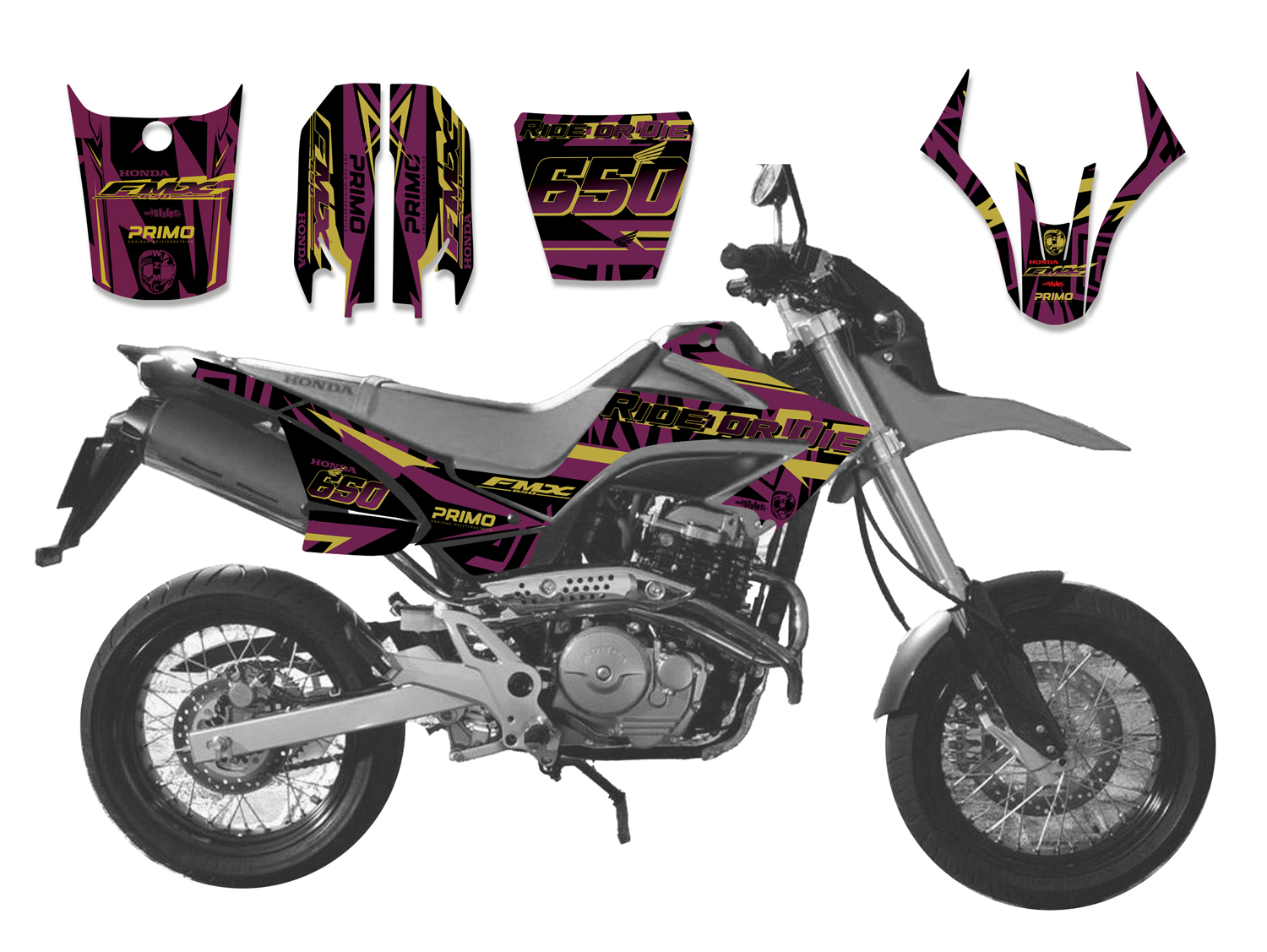 Description: full graphic KIT for HONDA FMX 650, 2005-2007 models. This kit includes the following decals: fork protectors le./ri., fender front/rear, rad covers le./ri. and a full number plate kit.