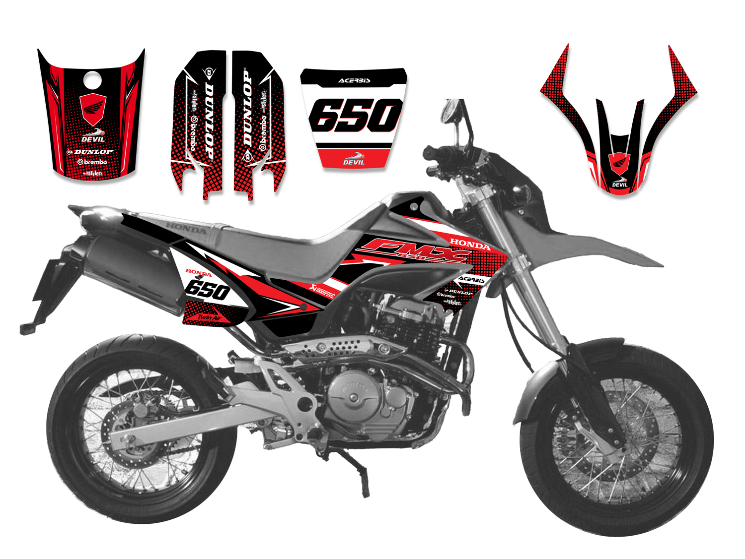 Description: full graphic KIT for HONDA FMX 650, 2005-2007 models. This kit includes the following decals: fork protectors le./ri., fender front/rear, rad covers le./ri. and a full number plate kit.