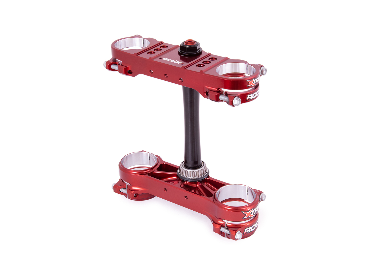 Das Revolutionary Opposing Clamp System kurz ROCS war eine der spektakulärsten und aufwändigsten Entwicklungen von XTRIG in den letzten Jahren. Die Vorteile dieses Systems im Vergleich zu einer konventionellen Gabelbrücke sind die geringere Verformung der Gabelstandrohre im Klemmbereich, was sich merklich auf das Ansprechverhalten der Gabel auswirkt. Aber auch die Konstruktion mit den beiden gegenüberliegenden Klemmschellen die durch den Selbsthemmungseffekt mehr Sicherheit gegen das Verdrehen der Gabel gewährleistet.